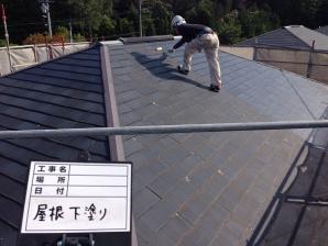 写真は、梅ちゃんが屋根の下塗りを行っている模様です。